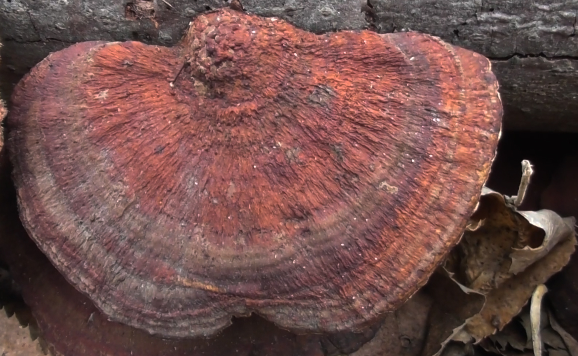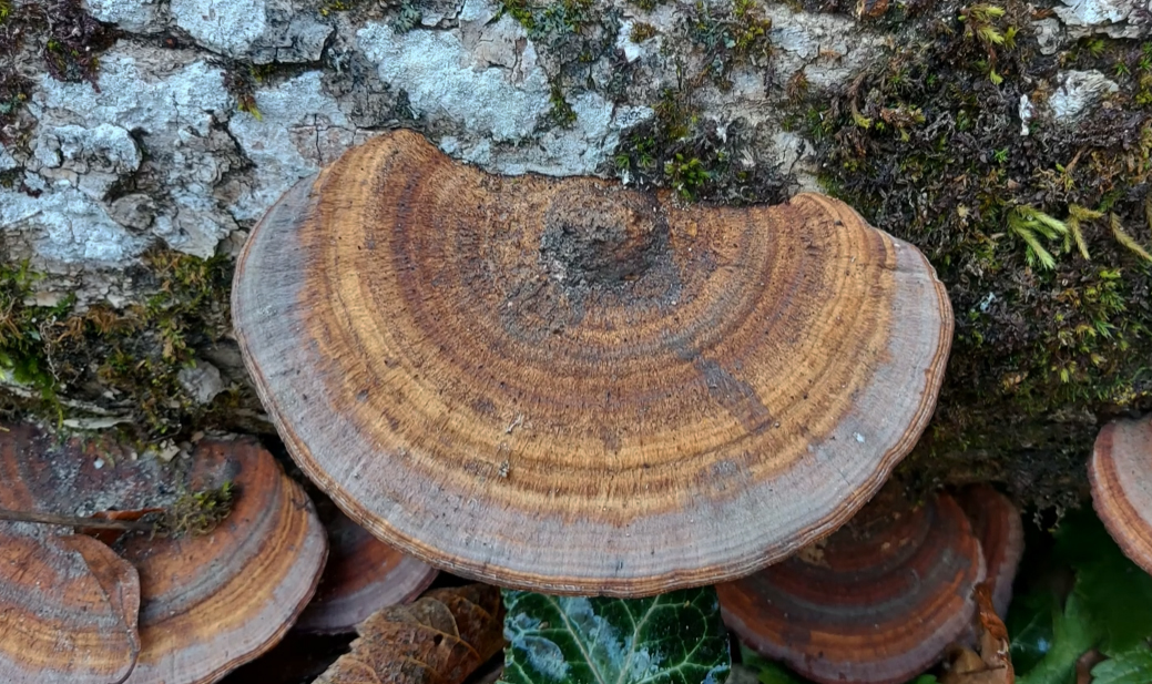 Corpul fructifer : are formă de evantai, cu diametrul de până la 10 cm și grosimea de 1–3 cm la punctul de atașare, adesea în straturi. Suprafața superioară este multizonată și de obicei roșiatică, prezentând prezintă mai multe benzi concentrice de culori (roșcat, brun și crem sau gri deschis), care i-au dat numele „tricolor”.