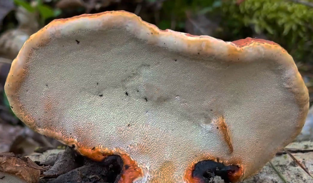 Suprafața inferioară este alcătuită din pori mici, sunt inițial de culoare albicioasă, crem sau galben-pai. Există aproximativ 3–4 (uneori până la 5) pori pe milimetru, fiind foarte deși și greu de distins cu ochiul liber fără o privire atentă. Sporii sunt netizi și de culoare alb sau crem-deschis. Pe măsură ce ciuperca îmbătrânește, suprafața devine brun-deschis sau de culoarea pielii. Dacă este zgâriată când e proaspătă, aceasta se poate păta ușor în nuanțe de galben-ocru. În perioadele de creștere activă și umiditate ridicată, ciuperca elimină picături de lichid (adesea limpezi sau opalescente), fenomen numit gutație. Deoarece ciuperca este perenă, ea adaugă în fiecare an un nou strat de tuburi peste cel vechi.